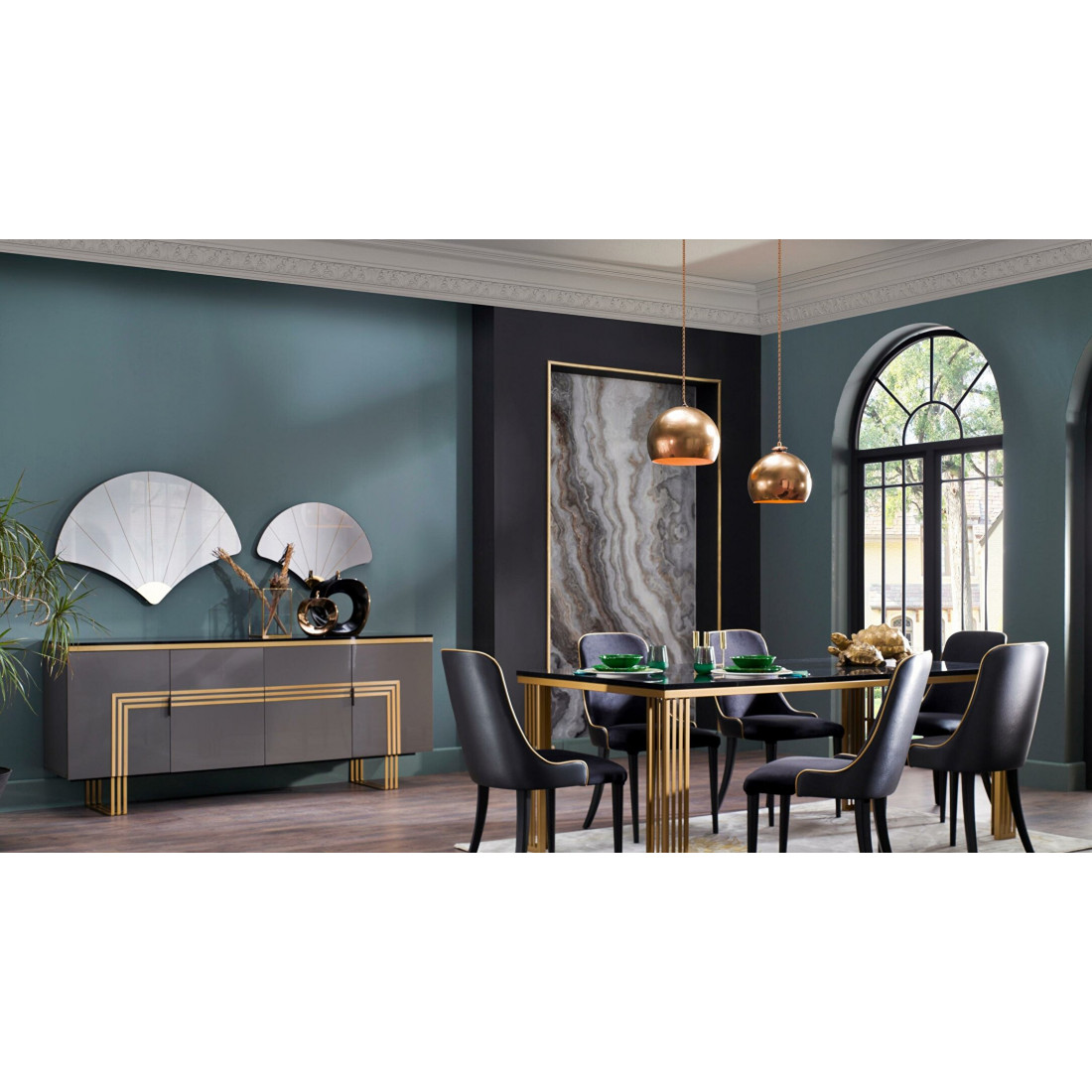 Длинный комод-буфет в гостиную Carlino CARL-10 выполнен в современном стиле Арт Деко. Его можно использовать как для хранения посуды, так и для хранения вещей. Оригинальный дизайн, комбинация фасадов цвета антрацит с золотой отделкой, необыкновенные по стилю металлические ножки -все это притягивает взгляд и не оставляет никого равнодушным. Комод длиной 2000мм , при относительно небольшой глубине 450мм прекрасно впишется в интерьер гостиной, столовой, спальни.За дверцами центральной части комода спрятан многофункиональный выдвижной ящик. Дверцы комода плавно закрываются. Глянцевая столешница черного цвета имеет золотистые мраморные разводы и отделана по контуру 3d кромкой.И как завершение композиции, дополнительный элемент комода -это комлпект из двух веерообразных зеркал Карлино CARL-24.