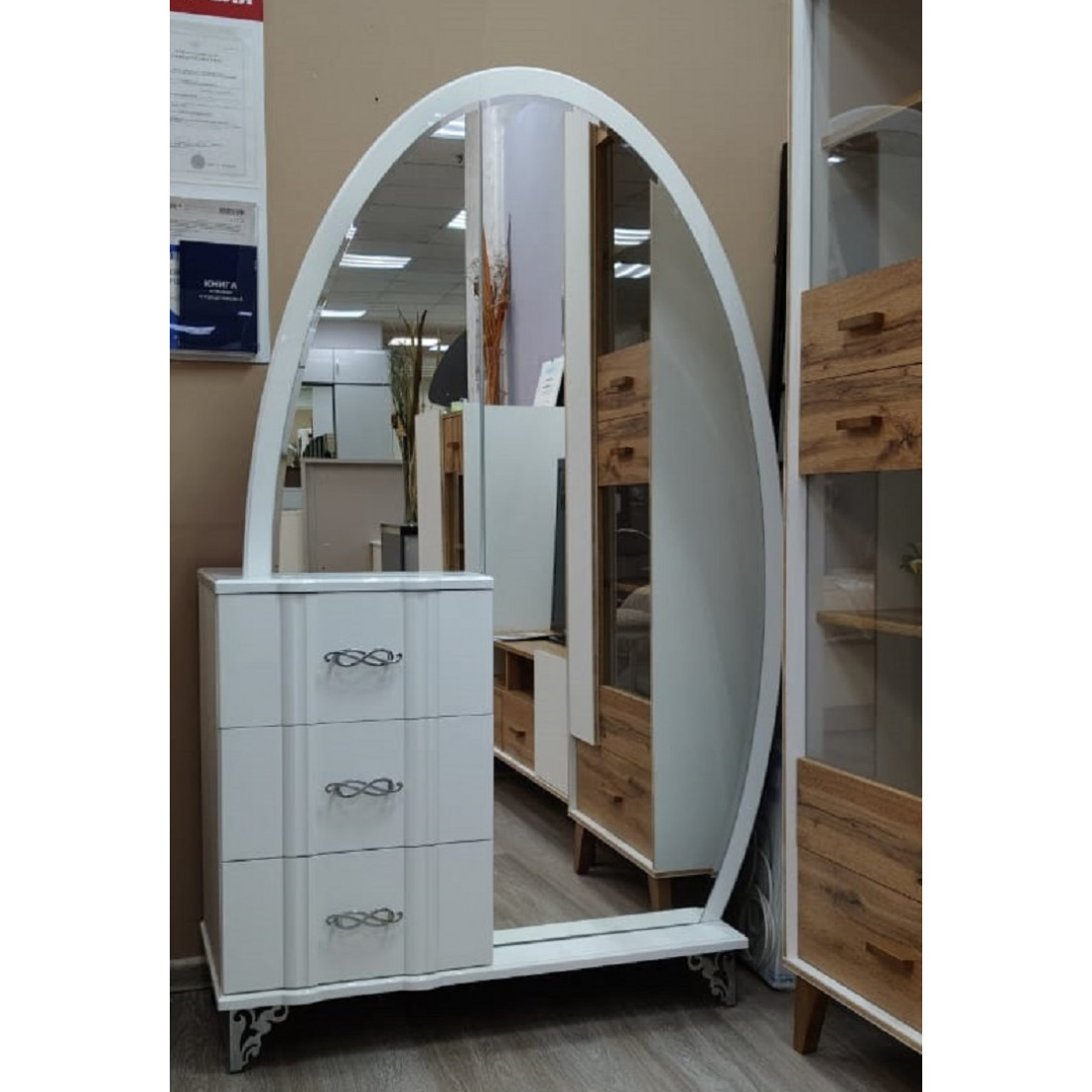 Комбинированный шкаф София МН-025-10 серии София от Мебель-Неман – очаровательная и неповторимая изюминка серии, способна преобразить классический интерьер до неузнаваемости. Округлой формы большое зеркало превратит спальню в роскошный аристократичный будуар, а тумбовые ящики заменят функционально комод. Купить комбинированный шкаф-трюмо – создать атмосферу элегантности и шарма в доме.