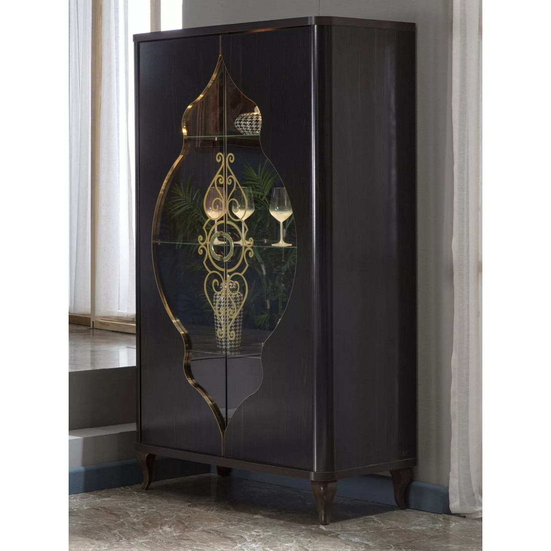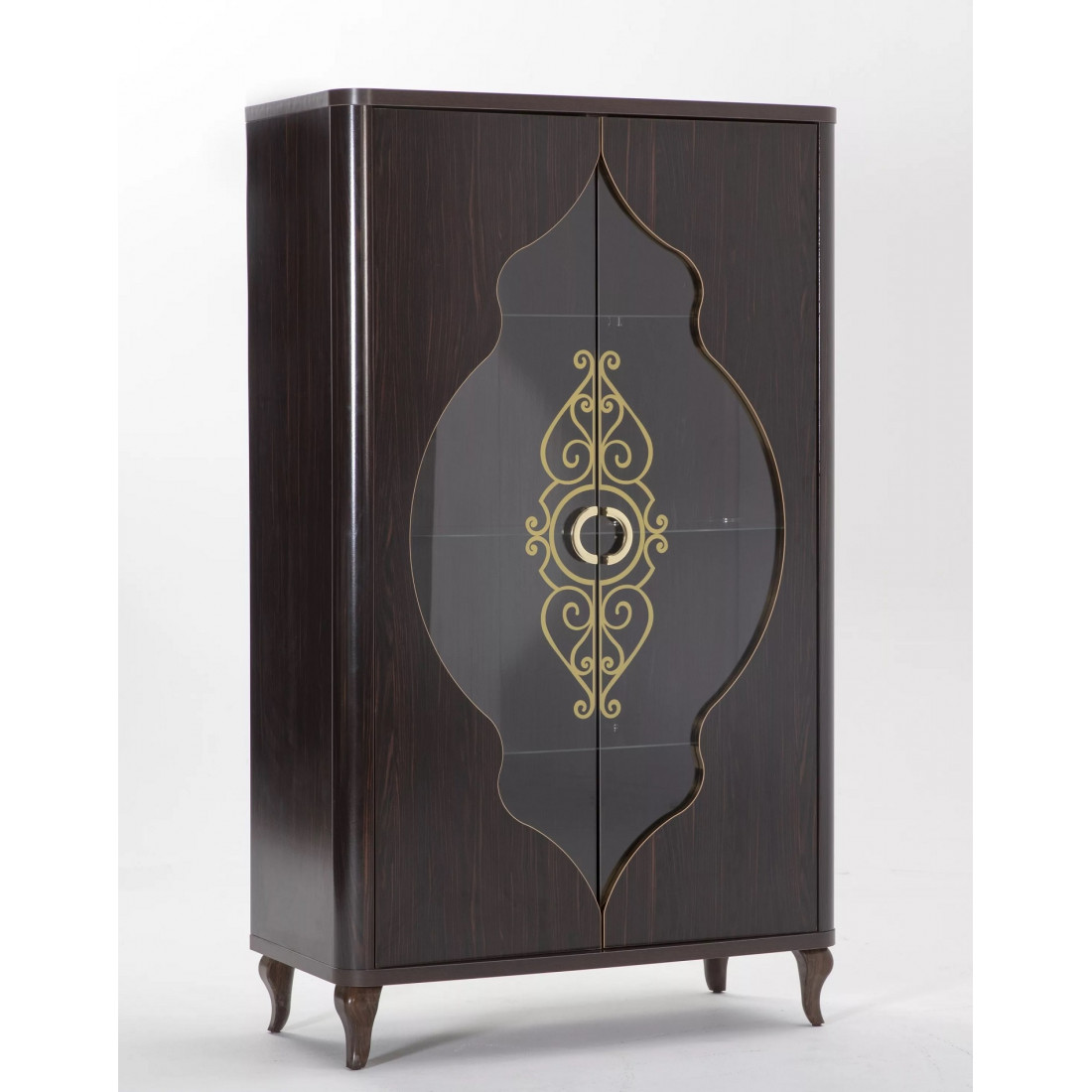 Дизайн шкафа для посуды "Легенда" определенно заслуживает Вашего внимания. Изделие представлено в классическом белом стиле с золотистыми рисунками на стеклянных дверцах и белыми изогнутыми сужающимися к полу ножками. За счет использования высококачественных материалов, удалось добиться долговечности данного изделия.